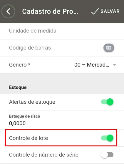 Preencha as informações de Nome, Preço de Custo, Preço de Venda e Gênero. Após isto, marque a opção Controle de Lote.