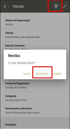 Para isso, localize a sua venda e clique sobre o ícone de impressora. Em seguida, clique em Imprimir.