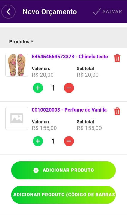 Nesta parte, é possível visualizar também a imagem do produto (se houver) dentro do cadastro do produto. Você também consegue adicionar ou diminuir as quantidades, clicando sobre o ícone de + ou–, excluir o produto clicando no ícone de lixeira, e adicionar outros produtos nos botões verdes abaixo.