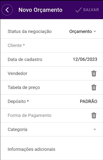 tatus da negociação: o sistema apresentará como Orçamento; Cliente: selecione o cliente para quem está fazendo a negociação. Este cliente deve estar previamente cadastrado no sistema; Data de cadastro: informe a data de cadastro da negociação; Vendedor: selecione o vendedor que realizou esta negociação. Este vendedor já deve estar previamente cadastrado no sistema; Tabela de preço: selecione a tabela de preço utilizada nesta negociação; Depósito: neste campo, é informado o depósito padrão da empresa selecionada para usar no aplicativo; Forma de Pagamento: selecione a forma de pagamento desta negociação; Categoria: selecione se esta negociação pertence à alguma categoria de venda. Saiba mais aqui; Informações adicionais: este campo é de texto livre para informar se esta negociação tem informações adicionais.