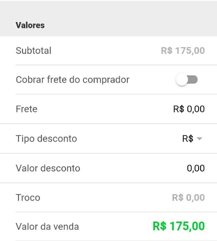 Subtotal: aqui será informado o valor total dos produtos, não é possível alterar este valor, é adicionado automaticamente pelo sistema; Cobrar frete do comprador: selecione este botão se deseja cobrar o valor do frete do comprador, então este valor é somado ao total dos produtos; Frete: informe o valor do frete deste negociação, se houver; Tipo de desconto: selecione o tipo de desconto, entre real e porcentagem, desta negociação, se houver; Valor desconto: informe o valor do desconto desta negociação, se acordo com o informado no campo acima, se houver; Troco: neste campo, é informado o valor do troco de vendas provenientes do PDV; Valor da venda: aqui será informado o valor total da venda, caso houver frete incluso ou descontos, será tudo calculado neste campo.