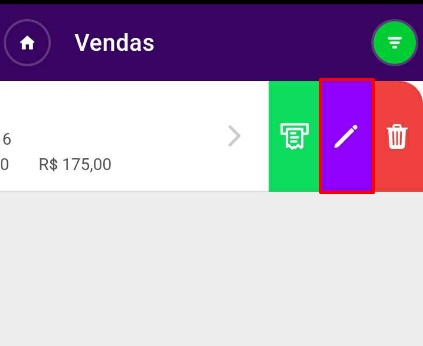 Após o pedido estar salvo, é possível localizá-lo na listagem das vendas. Arrastando o pedido para a esquerda, se abrirão opções de imprimir o recibo, editar e excluir.