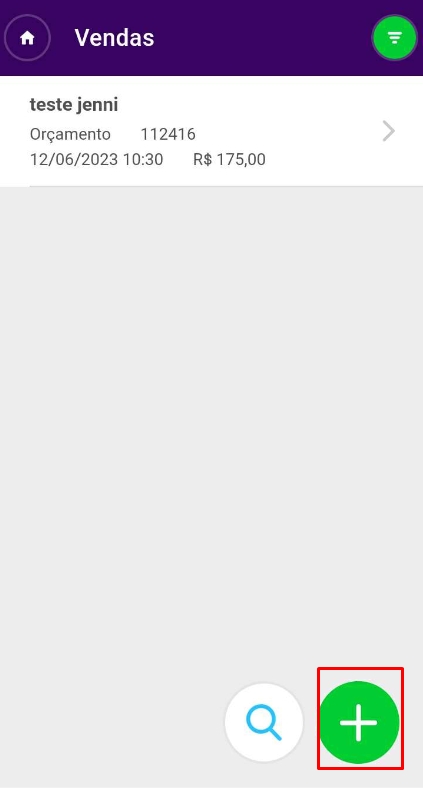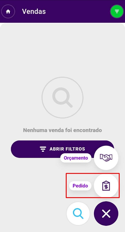 Então, para adicionar umNovo Pedido, clique no ícone de+, localizado no canto inferior direito do smartphone. Nesse momento, escolha Pedido ou utilize a lupa para localizar algum pedido/orçamento já existente.