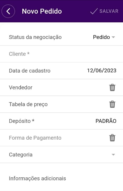 Status da negociação: o sistema apresentará como Pedido; Cliente: selecione o cliente para quem está fazendo a negociação. Este cliente deve estar previamente cadastrado no sistema; Data de cadastro: informe a data de cadastro da negociação; Vendedor: selecione o vendedor que realizou esta negociação. Este vendedor já deve estar previamente cadastrado no sistema; Tabela de preço: selecione a tabela de preço utilizada nesta negociação; Depósito: neste campo, é informado o depósito padrão da empresa selecionada para usar no aplicativo; Forma de Pagamento: selecione a forma de pagamento desta negociação; Categoria: selecione se esta negociação pertence à alguma categoria de venda. Saiba mais aqui; Informações adicionais: este campo é de texto livre para informar se esta negociação tem informações adicionais.