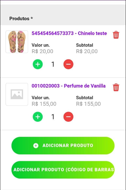 Nesta parte, é possível visualizar também a imagem do produto (se houver) dentro do cadastro do produto. É possível adicionar ou diminuir as quantidades, clicando sobre o ícone de + ou–, excluir o produto clicando no ícone de lixeira, e adicionar outros produtos nos botões verdes abaixo.