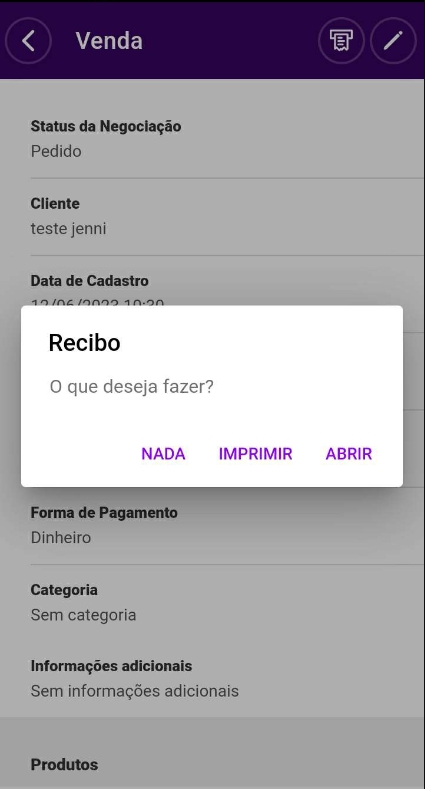 Selecione a opção desejada, sendo Nada para voltar, Imprimir para impressão do recibo e Abrir para apresentar as informações compostas no recibo.