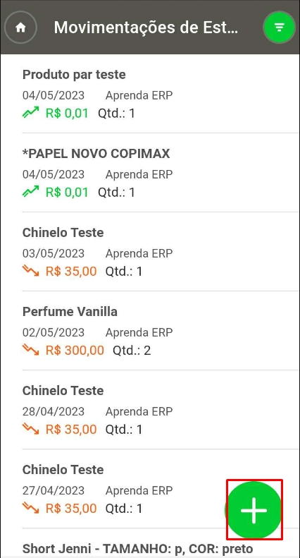 Assim, o sistema apresentará uma listagem de movimentações de seus produtos. Clique no ícone de mais, no canto inferior direito da tela.