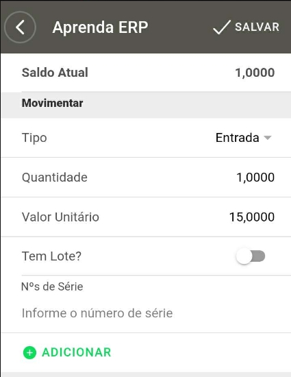 Depois de cadastrar oproduto controlado por série, já será possível definir qual será o saldo em estoque de cada um deles. Para realizar a entrada de produtos controlados por lote, basta acessar seu aplicativo Aprenda ERP e clicar em Movimentações.