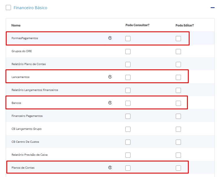 As opções de acesso ao financeiro, são utilizadas para que o usuário tenha acesso a funcionalidade disponibilizada, na qual não possui vinculo com a Dashboard Financeira que o Aprenda ERP apresenta: