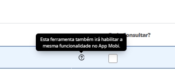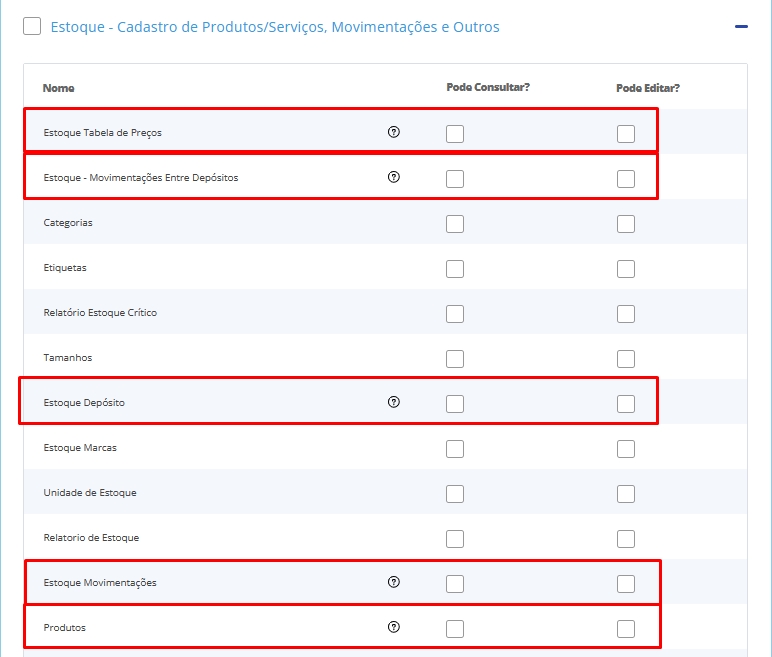Ao expandir os módulos que cada Tipo de usuário possui, é possível visualizar que algumas das opções possui um ponto de?, conforme print