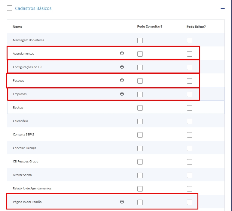 Destaque as opções referente a Cadastros Básicos, para disponibilizar no aplicativo Aprenda ERP as funcionalidades: