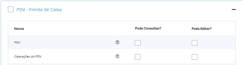 Ao destacar as opção de Pode Consultar? e Pode Editar? , o usuário a qual possui essa permissão terá acesso a vendas no módulo PDV do Aprenda ERP.