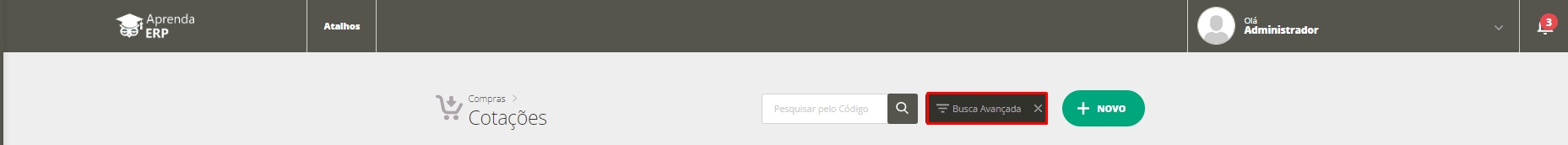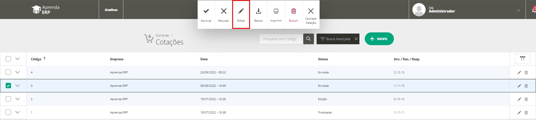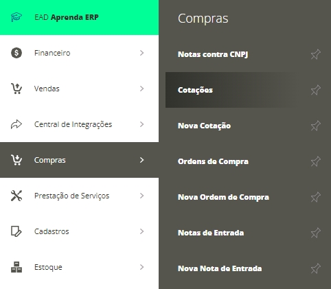 Para isso deve-se acessar o menu lateral Compras, submenu Cotações.