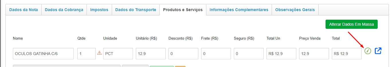 Ao ser apresentada a mensagem destacada acima, será necessário editar o produto em sua nota de entrada