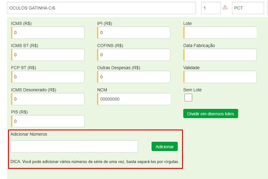 Onde poderá ser visualizado o campo de Adicionar números de série
