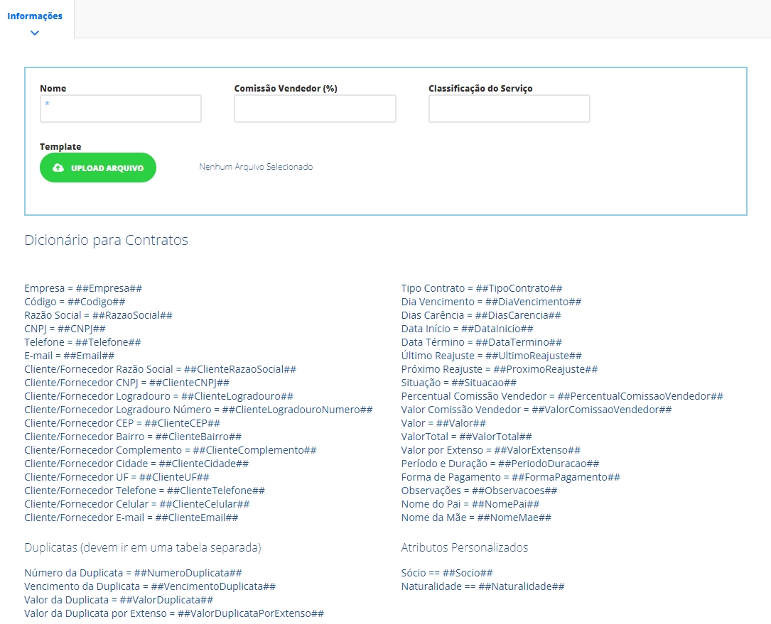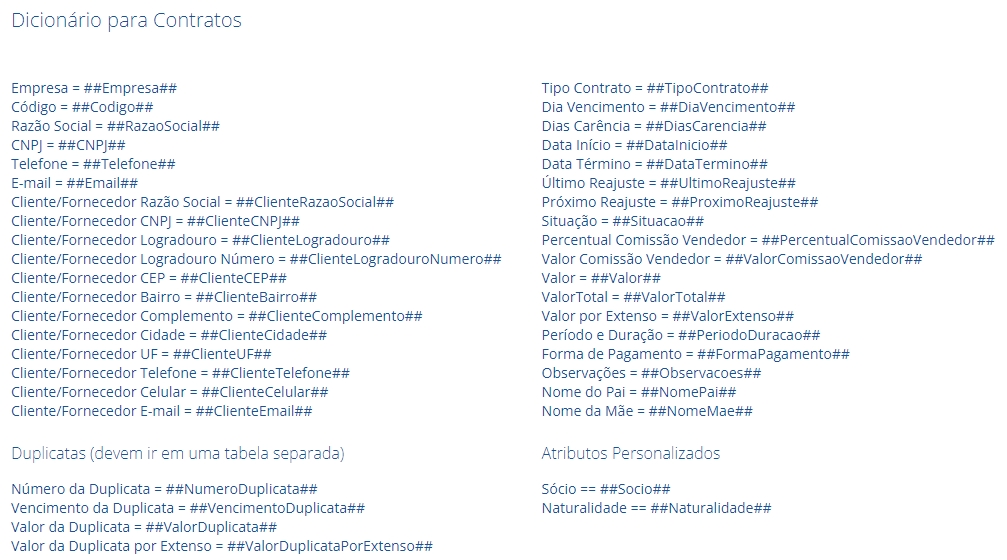 Quando necessário, utilize as TAGS presentes no Dicionário para contratos. É através delas que o sistema busca e insere no contrato as informações lançadas.