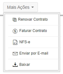 Renovar Contrato: ao clicar nesta opção, o sistema irá duplicar o cadastro deste contrato; Faturar Contrato: ao clicar nesta opção, o sistema irá gerar os lançamentos das parcelas estipuladas no contrato; NFS-e: você poderá gerar a NFS-e das parcelas desejadas do contrato; Enviar por E-mail: ao clicar nesta opção, o sistema enviará o contrato por e-mail para o cliente; Baixar: ao clicar nesta opção, o sistema irá realizar o download do documento do contrato; Lançar Comissão Vendedor: ao clicar nesta opção, o sistema realizará os lançamentos da comissão do vendedor. Esta opção aparecerá após faturar o contrato, caso você não possua a configuração de lançamento de comissão automática.