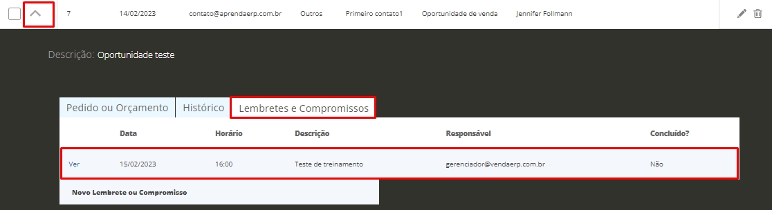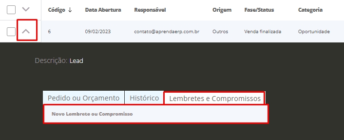 Após cadastrar seu agendamento, você poderá expandir novamente a sua oportunidade e na aba Lembretes e Compromissos o sistema terá criado o seu agendamento.