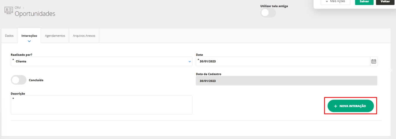 Para criar uma Interação, clique em Nova Interação. Assim o sistema adicionará novos campos ao final da página, para que sejam preenchidos com as informações da interação.