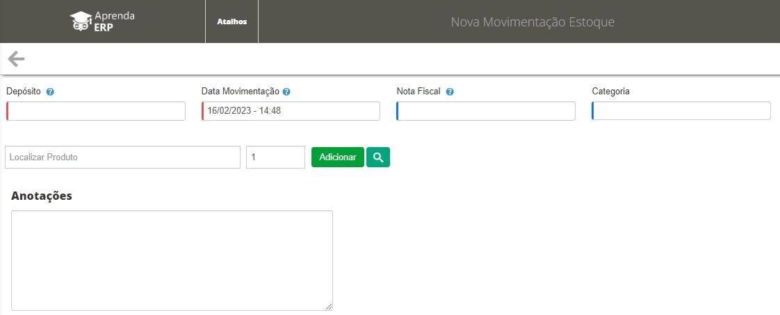 Depósito:selecionará qual dos seus depósitos o produto será movimentado; Dados da movimentação:automaticamente o sistema informará neste campo a data e hora atual, mas você poderá editar essa informação caso necessário; Nota Fiscal:informe o número de movimentação da nota fiscal equivalente a esse número de movimentação, se houver; Categoria:informe a categoria de movimentação, caso deseje.