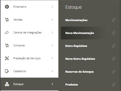 Após a adição do produto de controle por série, será necessário adicionar o saldo em estoque para o produto disponível para venda. Para isso, acesse o menu lateral Estoque,submenu Nova Movimentação.