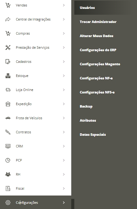 Primeiramente, acesse o menu lateral Configurações, submenu Usuários.