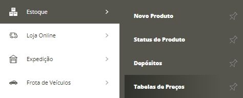 Sabendo disso, para baixar a planilha, acesse o menu lateral Estoque, submenu Tabelas de Preços.