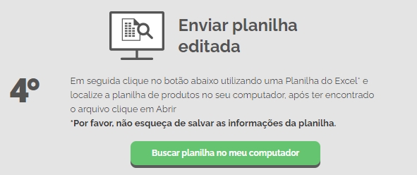 Após fazer as alterações desejadas, salve a planilha no seu computador, e no mesmo local onde ela foi baixada do sistema, faça o upload novamente para o sistema ler as novas informações, clicando em Buscar planilha no meu computador.