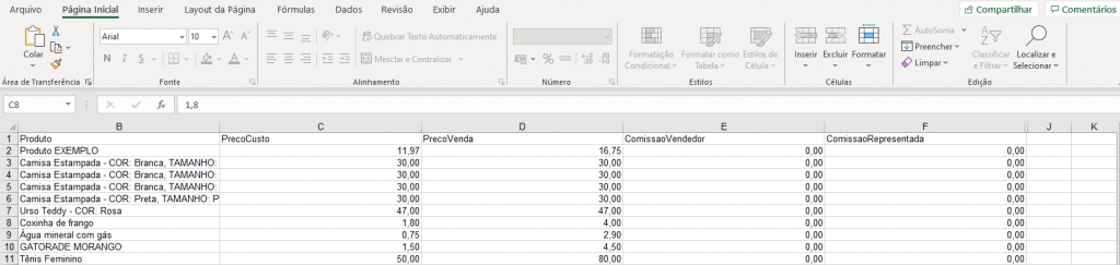 Ao baixar a planilha no seu computador, abra o arquivo e verá as seguintes colunas: