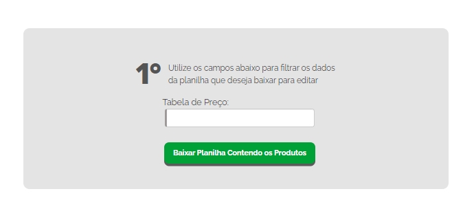 Na próxima tela, selecione a tabela desejada no campo Tabela de Preço, e clique em Baixar Planilha Contendo os Produtos.