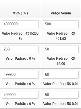 MVA (%): informe em porcentagem, a margem de lucro desejada sobre o custo do produto. A partir desta informação será definido o valor de venda do produto; Preço de venda: informe o preço de venda do produto, em reais. Caso não tenha informado o MVA, automaticamente o sistema informará a porcentagem de acordo com o preço de venda definido.