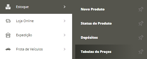 Para definir o preço de venda do produto, acesse o menu lateral Estoque, submenu Tabela de Preços.
