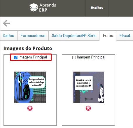 Ao inserir mais de uma imagem para o produto, você poderá selecionar qual delas será a principal, ou seja, a que aparecerá como padrão para o produto. Para isto, basta marcar o checkbox Imagem Principal na foto desejada.