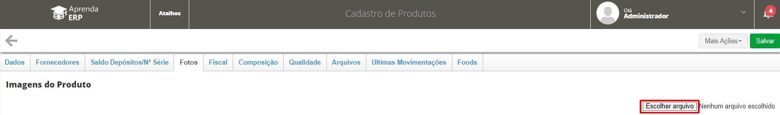Estando na tela de edição do produto, vá até a aba Fotos, em seguida basta clicar em Escolher arquivoe adicionar no cadastro.