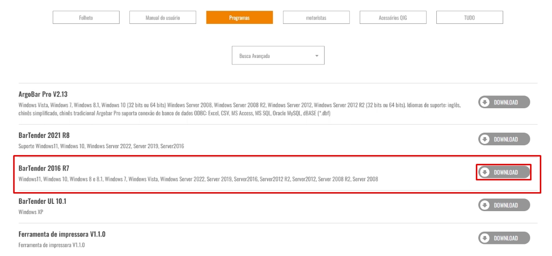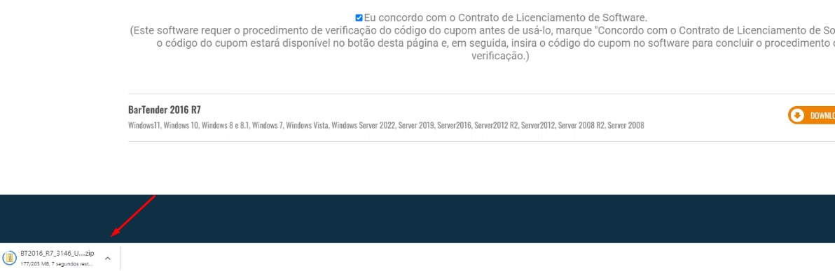 Feito isso, basta clicar no ícone de Download do terceiro aplicativo BarTender 2016 R7.