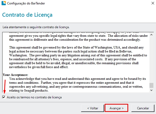 Agora, será necessário aceitar os termos de uso para continuar, dessa forma marque o campoe clique em avançar.