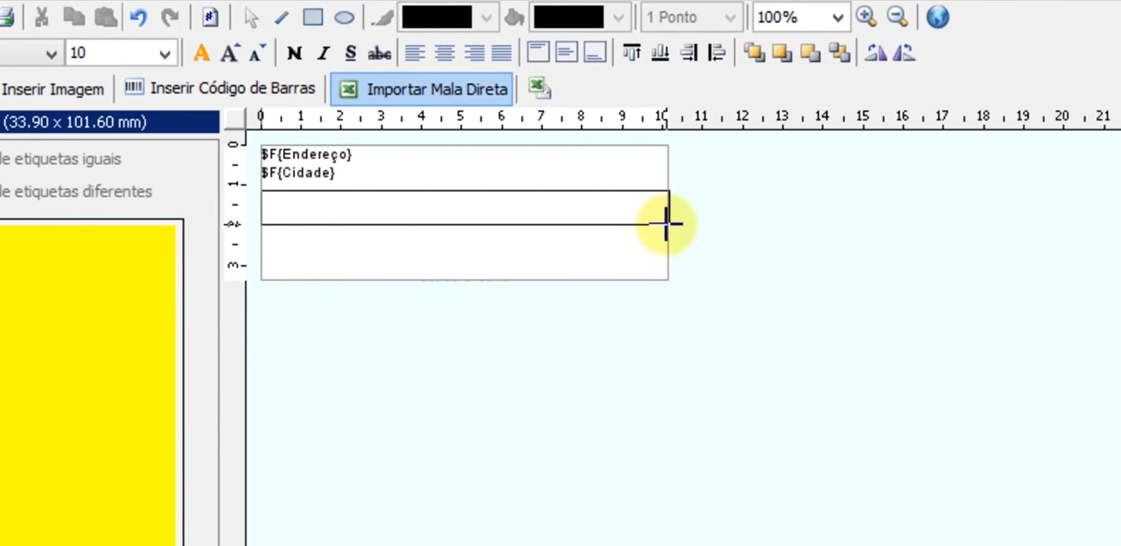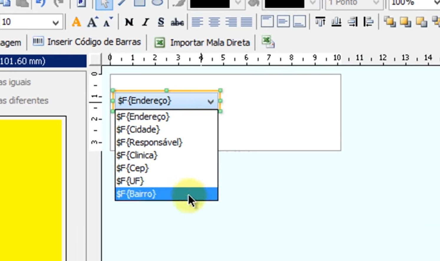 Agora, você deve informar qual coluna da planilha deve ser apresentada nesse espaço selecionado na etiqueta teste.