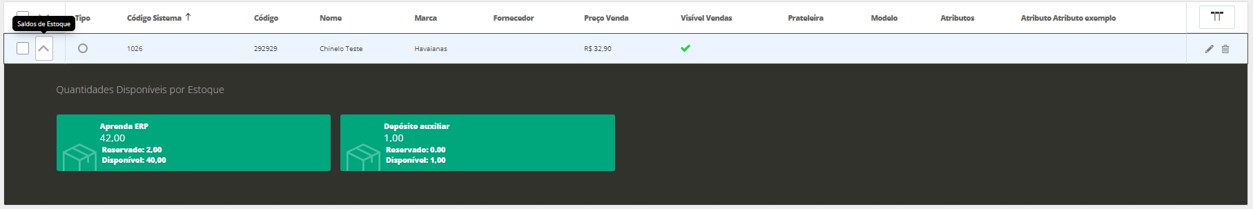 Ao acessar a tela da listagem de produtos, iremos clicar na seta ao lado do código do produto, para expandir os dados de estoque do mesmo. Dessa forma, será possível visualizar todos os depósitos cadastrados, e quais as quantidades do item em cada depósito.