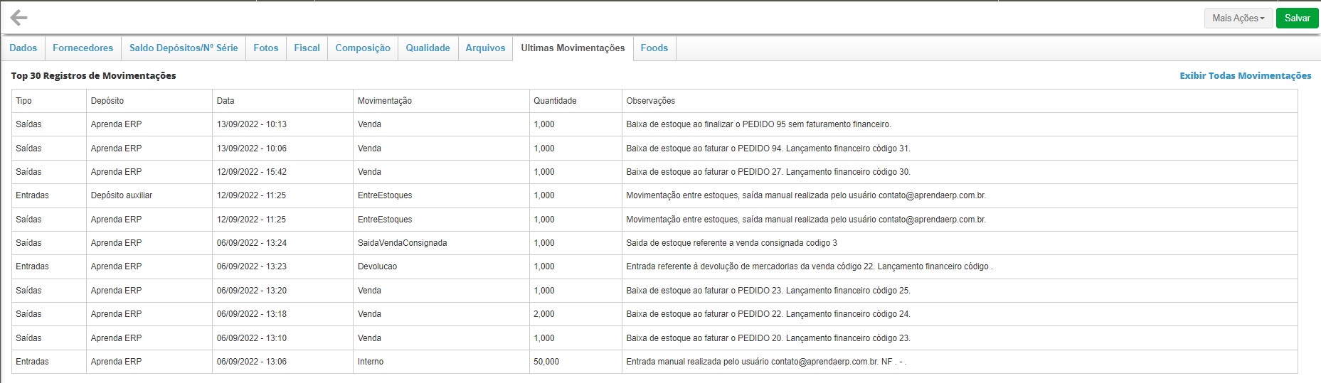 E por último, há a possibilidade de usar a ferramenta Ultimas Movimentações dentro do cadastro do produto. Através dela é possível visualizar todas as entradas e saídas, quantidades, e por onde essas movimentações foram feitas. Essa ferramenta é ótima quando o você deseja verificar exatamente o que houve com uma determinada quantidade do produto.