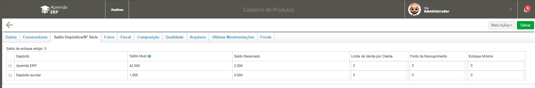 Além dessa forma, podemos editar o cadastro do produto, clicando no ícone de lápis, e na aba Saldos depósitos/Nº de serie, podemos também ver as quantidades em cada depósito, e consultar os números de série, caso você tenha produtos controlados dessa forma.