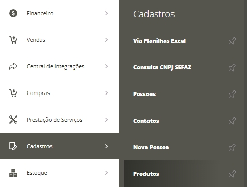 A primeira forma de consultarmos, é acessando a listagem de produtos, acessando o menu lateral Cadastros, submenu Produtos.