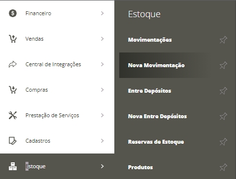 Para isso, acesse o menu lateral Estoque, submenu Nova Movimentação.