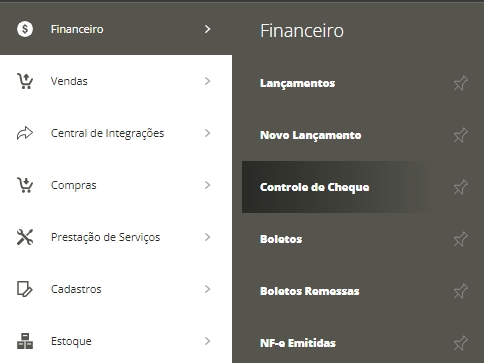 Antes de mais nada, será necessário acessar o menu lateral Financeiro, submenu Controle de Cheques.