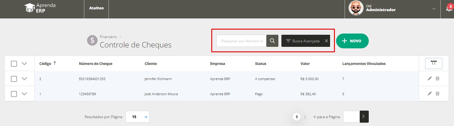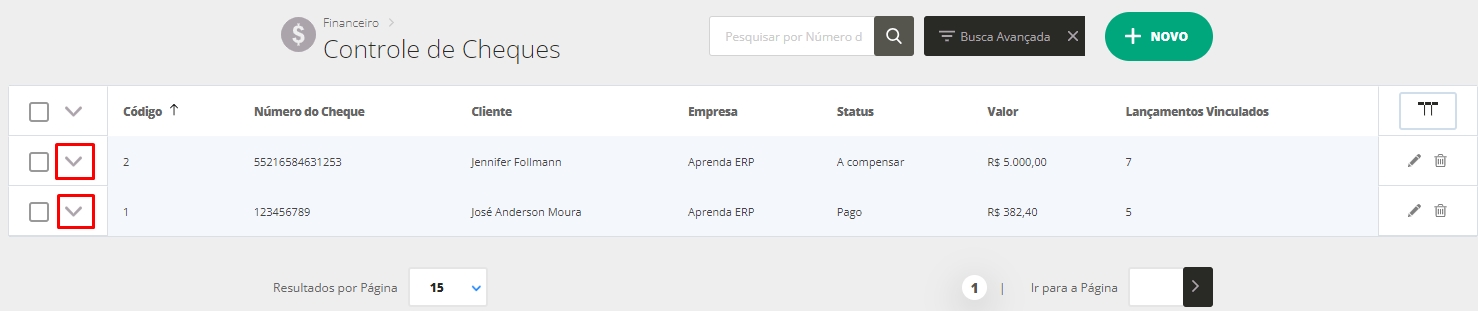 Feito isso, será possível verificar os registros de cheques juntamente com a possibilidade de realizar uma busca pelo seu número em específico e também na busca avançada, auxiliando na busca precisa de um cheque cadastrado.