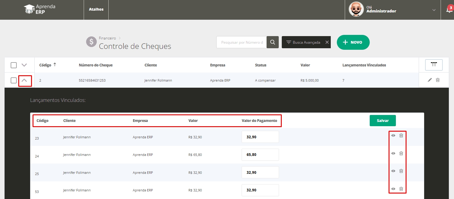 E pronto, com isso já será possível realizar a consulta exata dos lançamentos vinculados a esse cheque, acompanhado de dados como, Código, Cliente, Empresa, Valor, Valor do Pagamento, e ainda, a possibilidade de Abrir o Lançamento ou Excluí-lo, basta clicar nos ícones indicativos de Olho e Lixeira no fim das descrições.