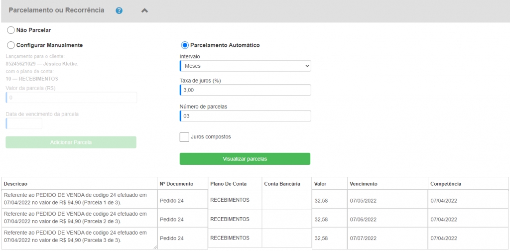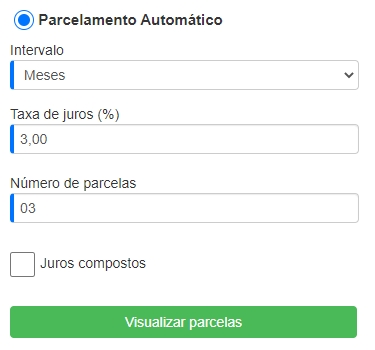 Você deverá selecionar a opção Parcelamento Automático ou Recorrência Automática. Assim, o sistema lhe apresentará o campo Taxa de juros (%), onde você poderá informar a porcentagem desejada.