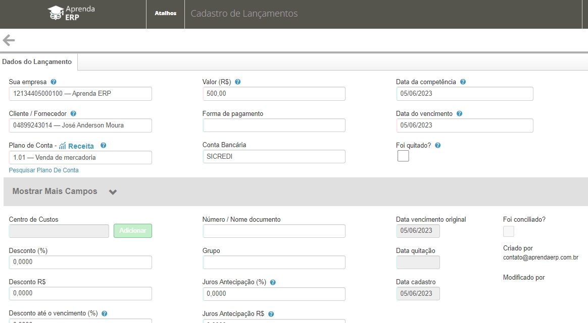 Agora preencha as principais informações, como Cliente, ValorePlano de Contas.