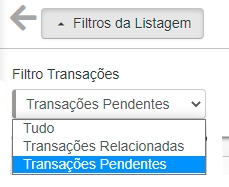 Tudo: busque por todas as transações sem distinção; Transações Relacionadas: busque por transações que estão relacionadas à lançamentos financeiros; Transações Pendentes: busque por transações que não estão vinculadas ao lançamento.