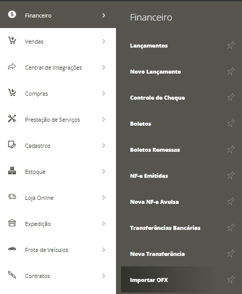 Para você importar este arquivo, será necessário acessar o menu lateralFinanceiro, submenu Importar OFX.