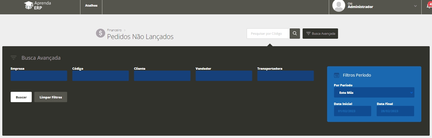 Empresa: informe a empresa que deseja visualizar os pedidos não faturados; Código: informe o código do pedido não faturado que deseja visualizar; Cliente: informe o nome do cliente que deseja visualizar os pedidos não faturados; Vendedor: informe o vendedor do qual deseja visualizar os pedidos não faturados; Transportadora: informe a transportadora da qual deseja visualizar os pedidos não faturados; Por Período: selecione o período de data desejado para realizar a busca. Caso selecione a opção Personalizado utilize os campos de Data Inicial e Data Final para definir o período; Data Inicial: defina uma data para iniciar o período da busca; Data Final: defina uma data para finalizar o período da busca.